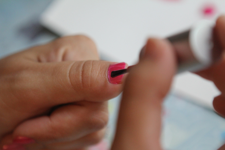 Use the light color on your pinkie nail. It is tricky to do a second coat of color, so lay this first coat on thick.